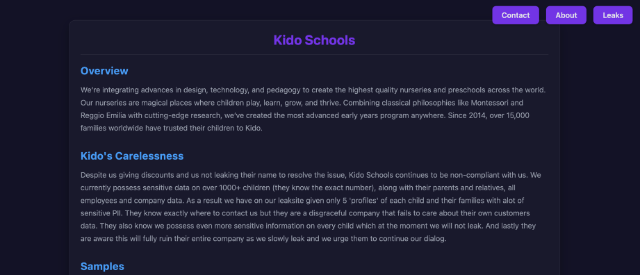 Nakon što su kompromitovali Kido-ove sisteme, sajber kriminalna grupa poznata kao Radiant Group tvrdila je da je ukrala osjetljive podatke i fotografije više od 1.000 djece, a zatim je na svom dark web sajtu objavila slike i adrese dijela njih, pokušavajući da iznudi novac od vrtića.